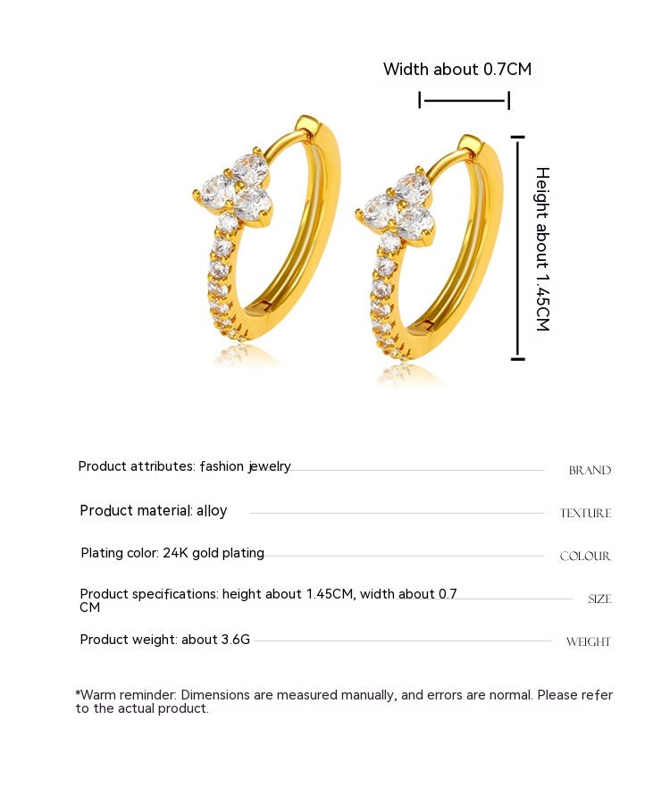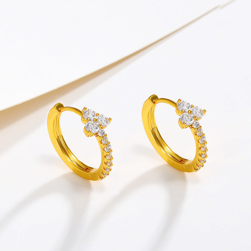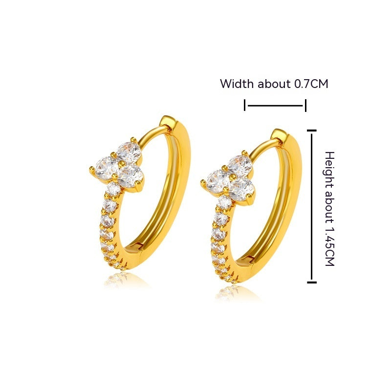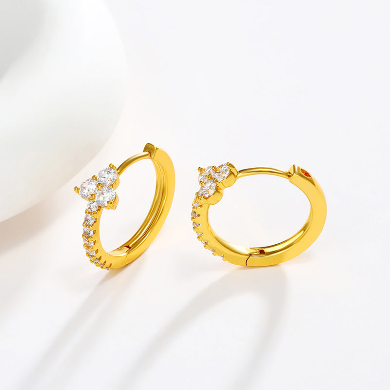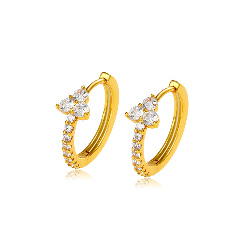 Introducing the Fashionable Gold Plated Zirconium Flower Earrings... Crafted with 24K gold plating and adorned with shimmering zirconium, these earrings showcase a beautiful flower design with three-petal elements. Their delicate style makes them an ideal choice for adding a touch of charm to your everyday look or for a special event.