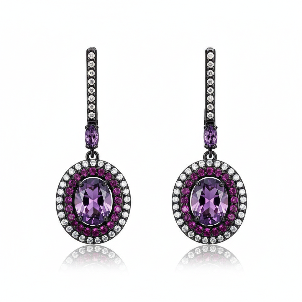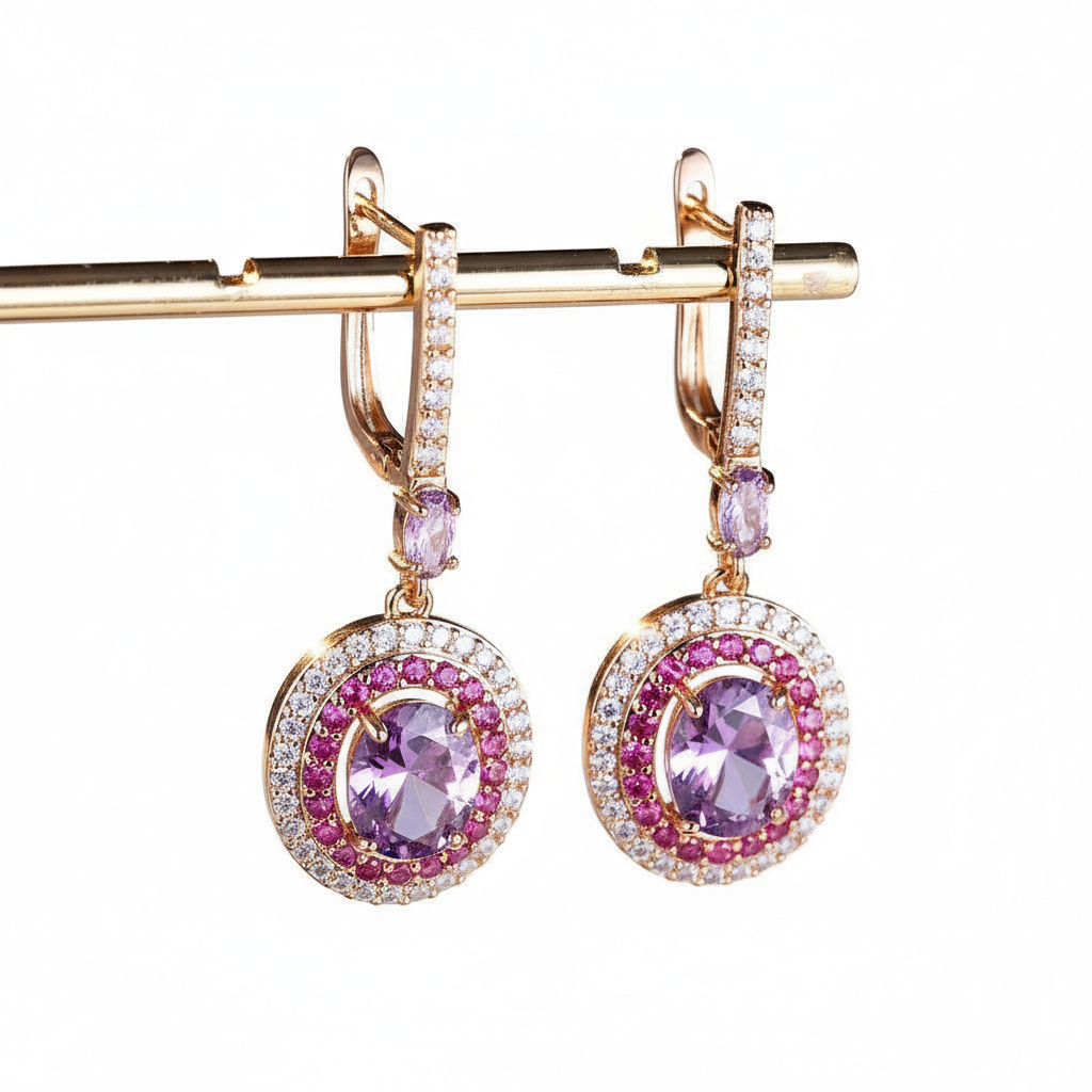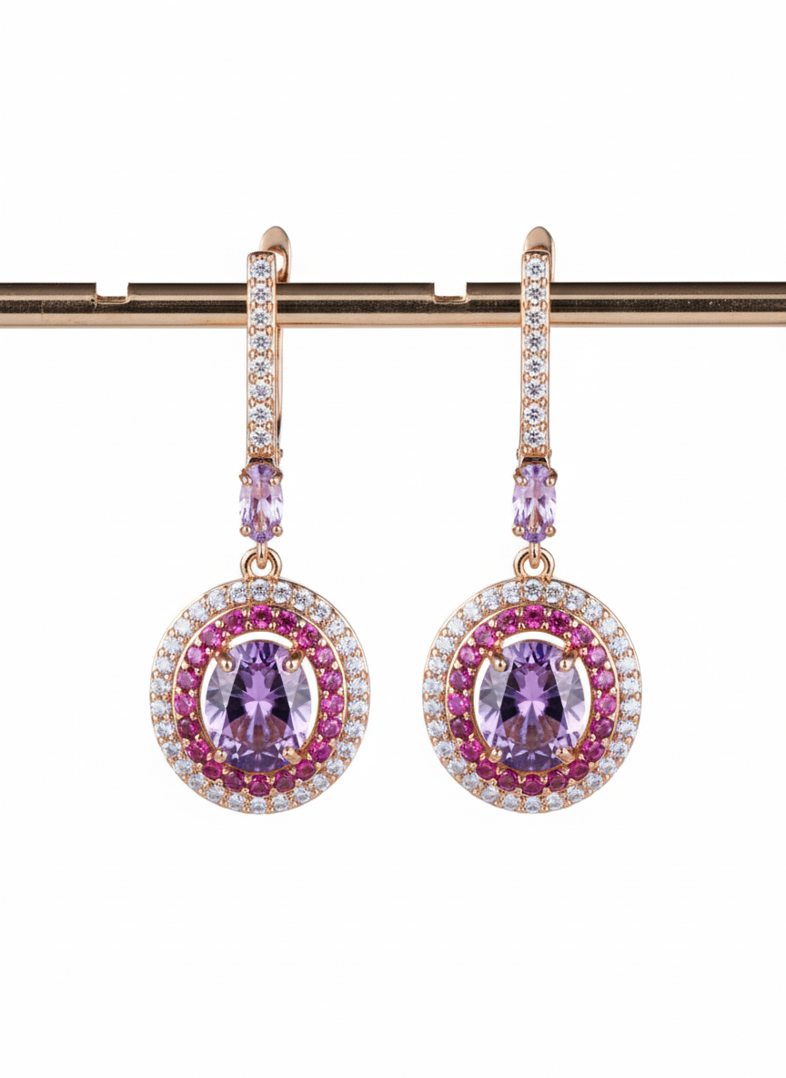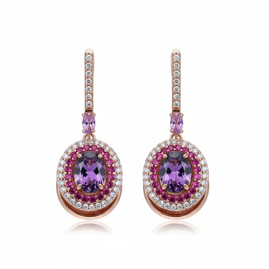 This enchanting pair of Copper Purple Diamond Geometric Earrings is crafted with champagne gold, platinum, and rose gold, adorned with stunning purple diamonds. Their unique geometric design adds a sophisticated touch to your ensemble. Pair them with a sleek updo for a striking look that's sure to turn heads.